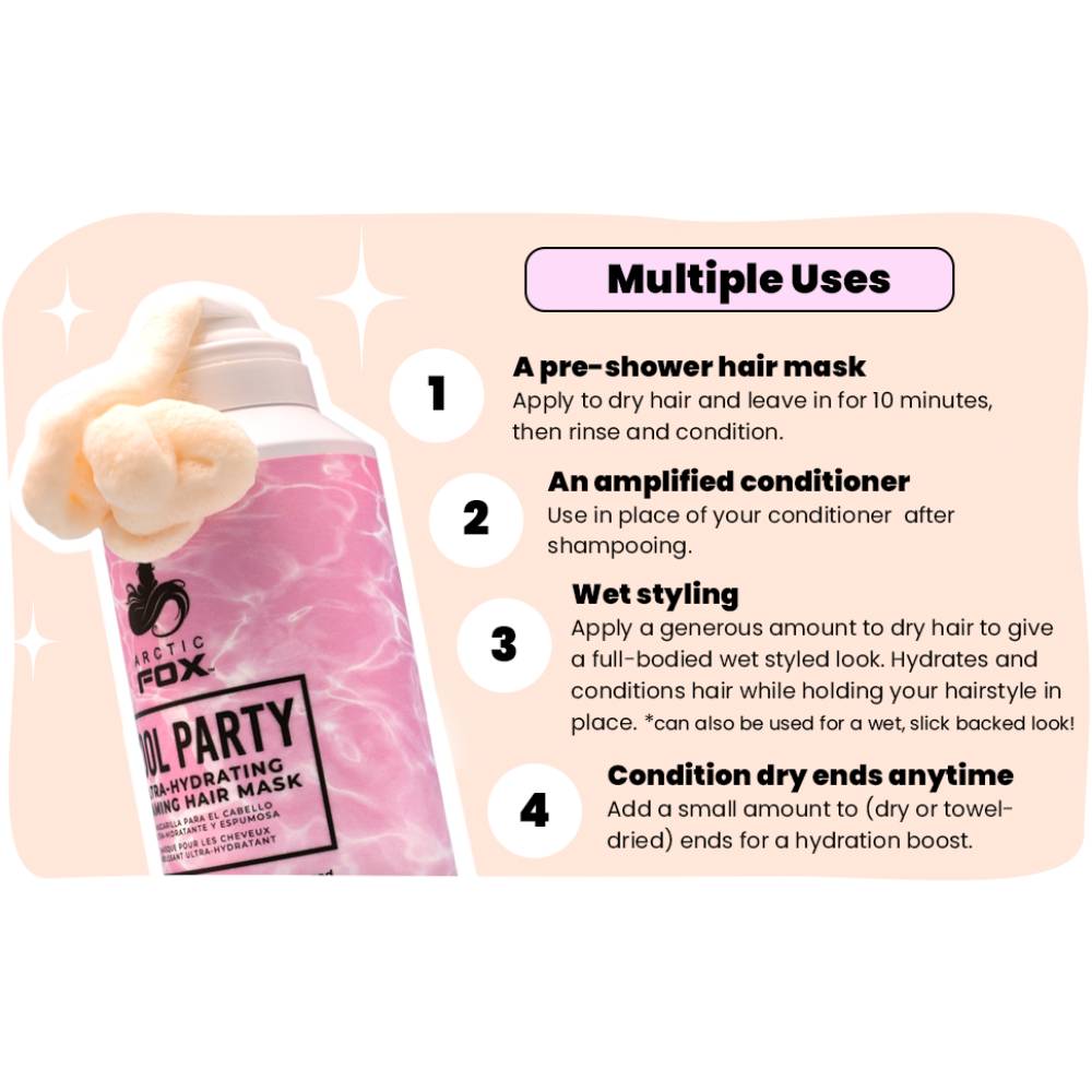 Your hair needs a lifeguard—we’ve got you! Pool Party Ultra-Hydrating Foaming Hair Mask is formulated with Polycare® Split Therapy which leaves dry, brittle hair soft, manageable, and smooth AF. The ultra-hydrating formula gently repairs damaged hair with healthy antioxidants, omegas and natural oils. The results from this mask are mostly seen and felt after hair has dried.