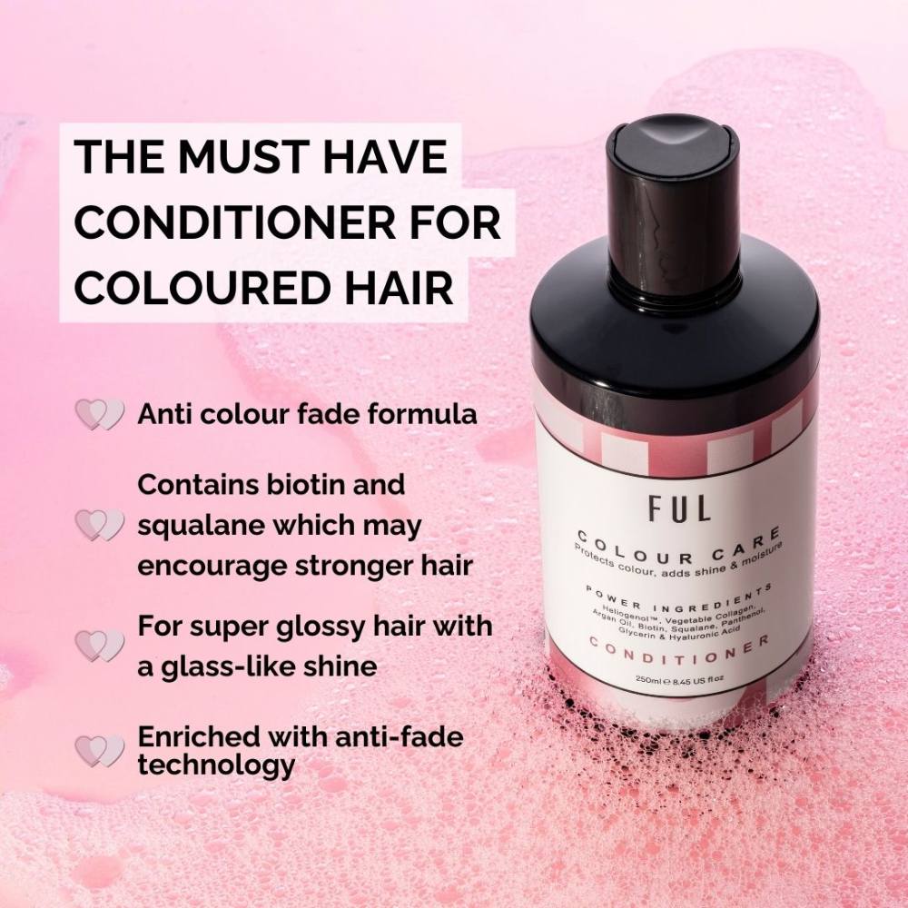 FUL Colour Care Conditioner protects coloured hair from fading, boosts shine, and strengthens strands with a multi-active, colour-lock formula infused with biotin and squalane. This must-have, anti-fade conditioner helps prevent breakage and leaves hair with a glossy, glass-like finish. It gently nourishes and refreshes hair, helping to maintain vibrant colour and a healthy feel. Perfect for everyday use, it keeps your hair soft, smooth, and full of life.