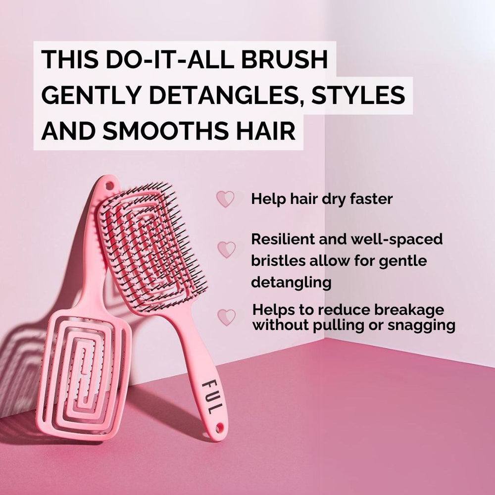 FUL Vented Hair Brush is your do-it-all brush for quick drying, gentle detangling, and frizz control. Designed with a flexible, vented body and soft pin bristles, it distributes airflow evenly to reduce drying time while gliding smoothly through strands to prevent breakage and knots. This lightweight tool adds volume, smooths flyaways, and creates a sleek, salon-grade finish, making it perfect for all hair types and daily styling routines.