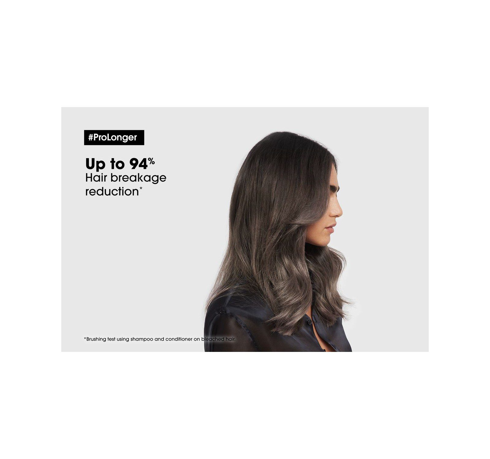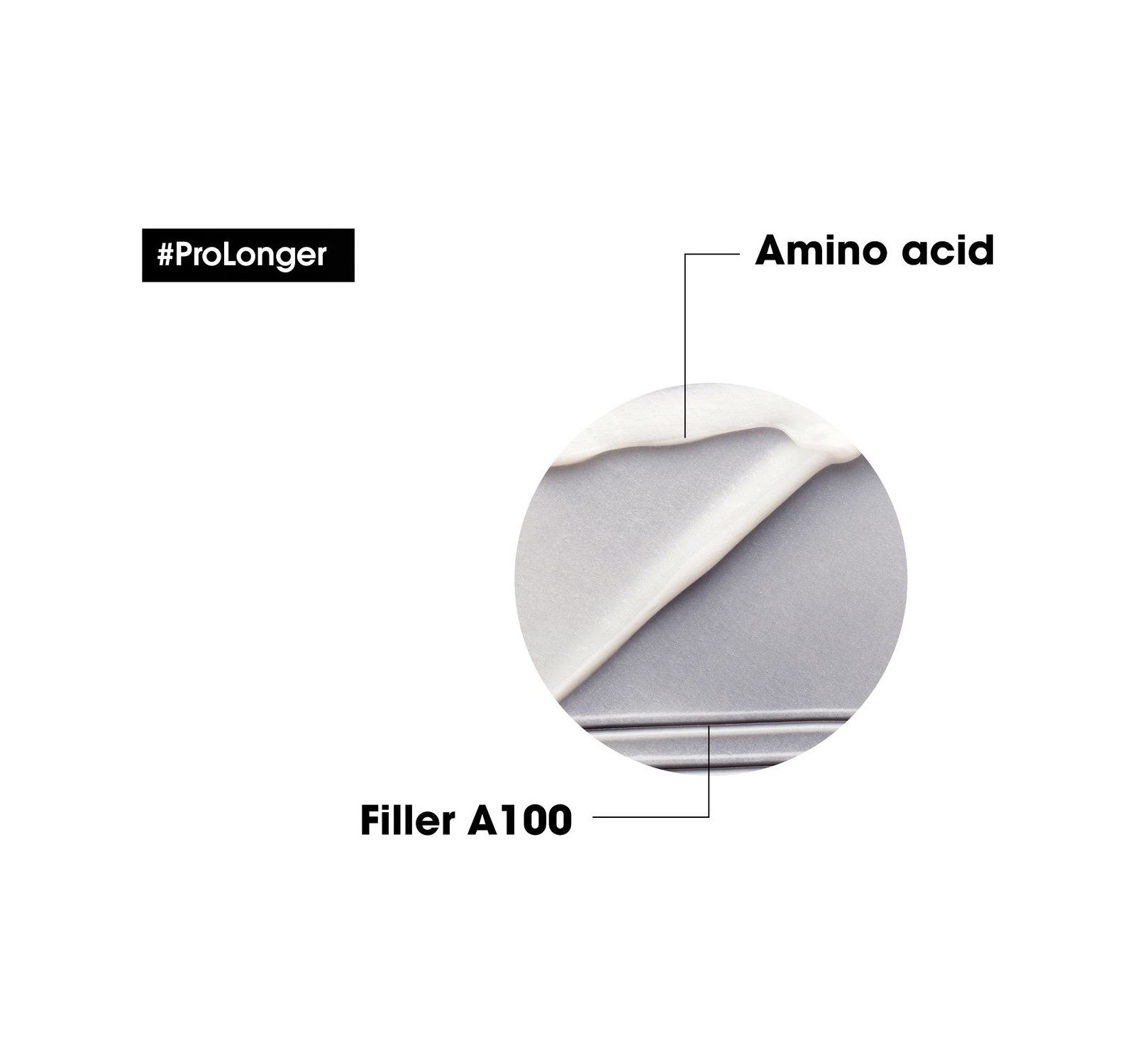Pro Longer conditioner for long hair helps to make long hair appear thicker and visibly healthier and stronger looking. When used with the Pro Longer shampoo for long hair, there is a hair breakage reduction*. The Filler A-100 technology used is patented to L'Oréal Professionnel, and it works by penetrating the fiber core to plump and thicken the hair from the inside. The formula works on thin ends, or areas where help is most needed.