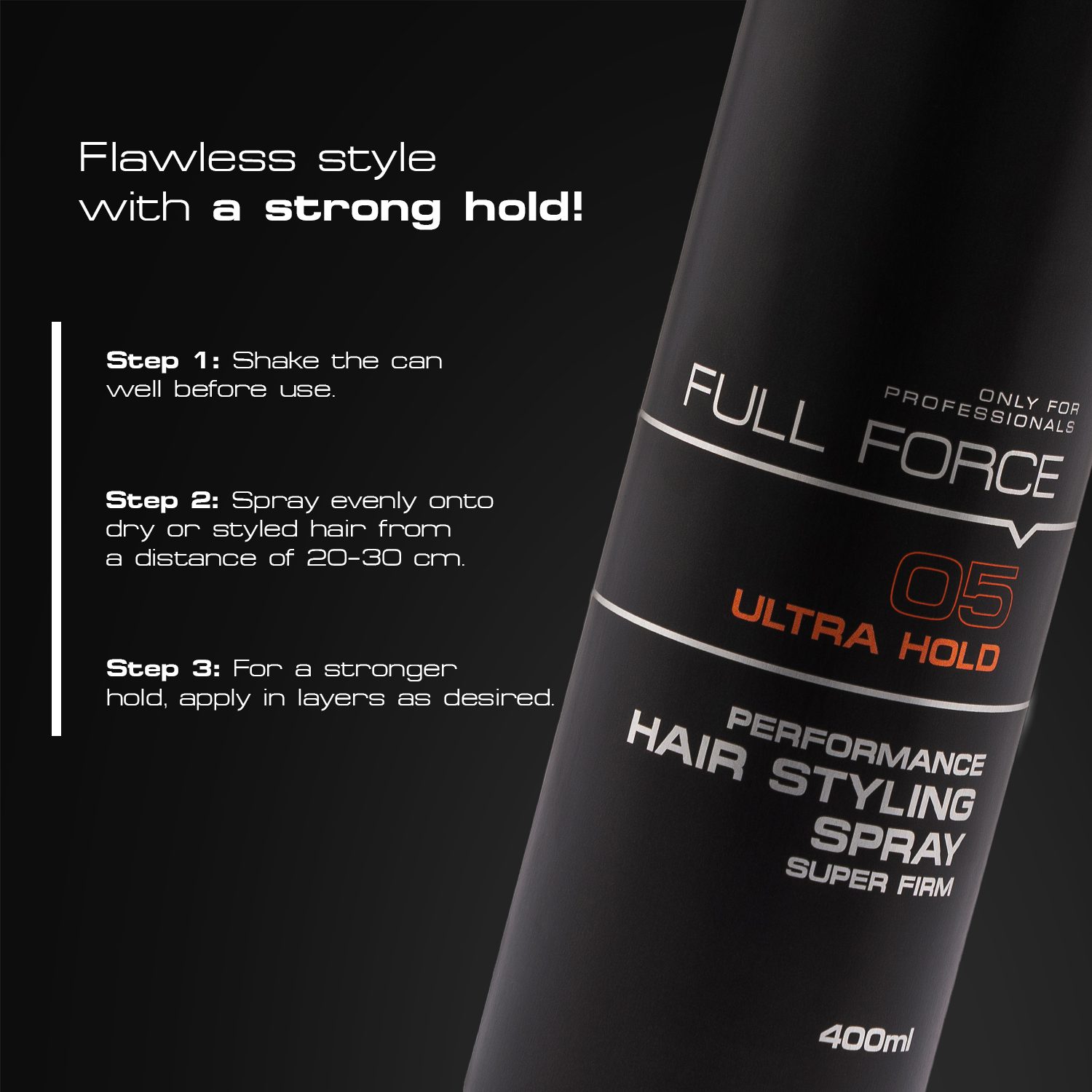 RedOne full force hairspray works great with all hair types. This super firm spray adds great volume to any look, fast drying, and most importantly holds hair in place all day. Just like other products in the RedOne line, this hairspray has a fresh long lasting scent and great shine.