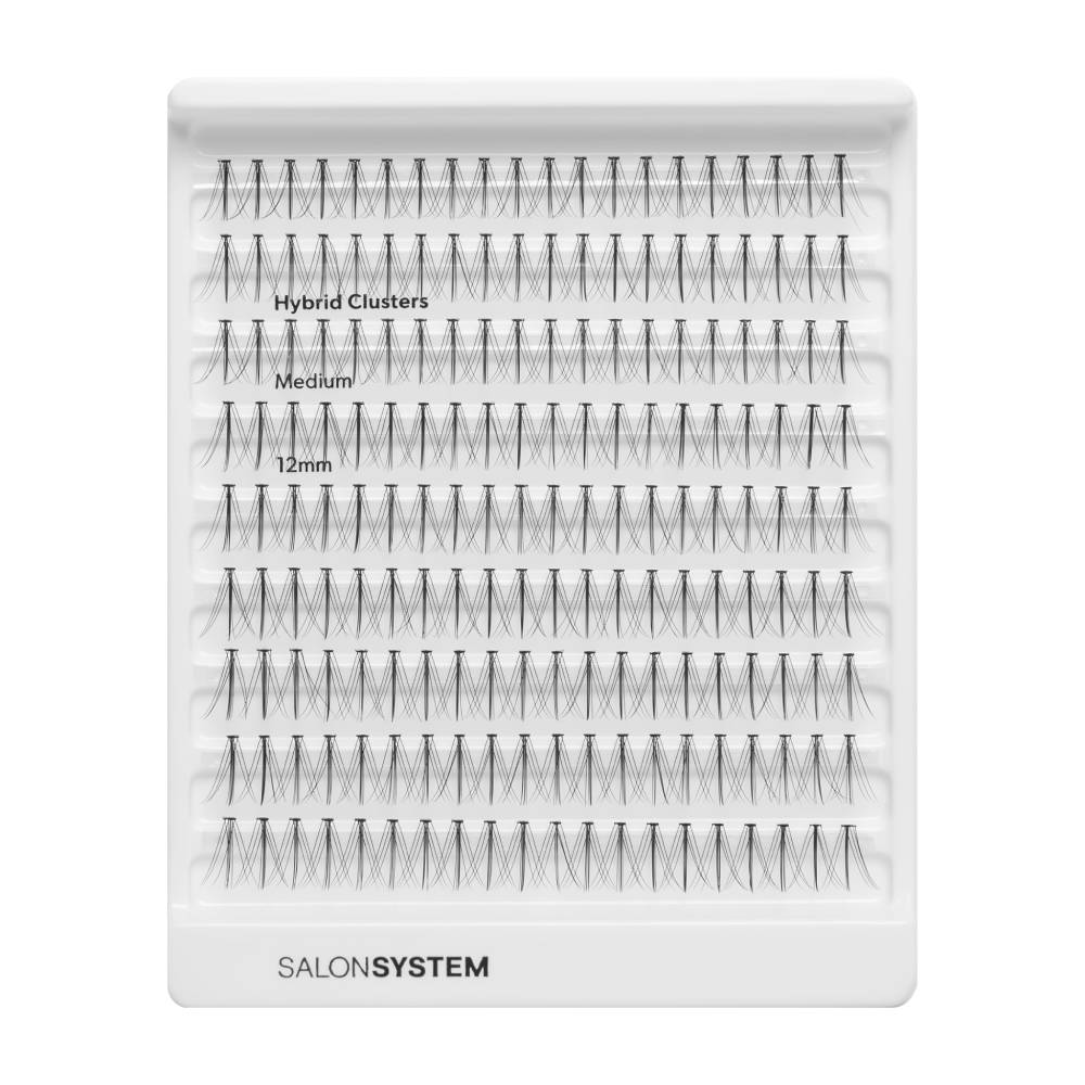 Introducing the Hybrid Cluster Lashes from Salon System. These medium length lash clusters blend lightweight, natural-looking fibres with a soft, wispy wet-look finish to create beautifully textured lashes. Now available in a convenient value tray containing 180 individual clusters.