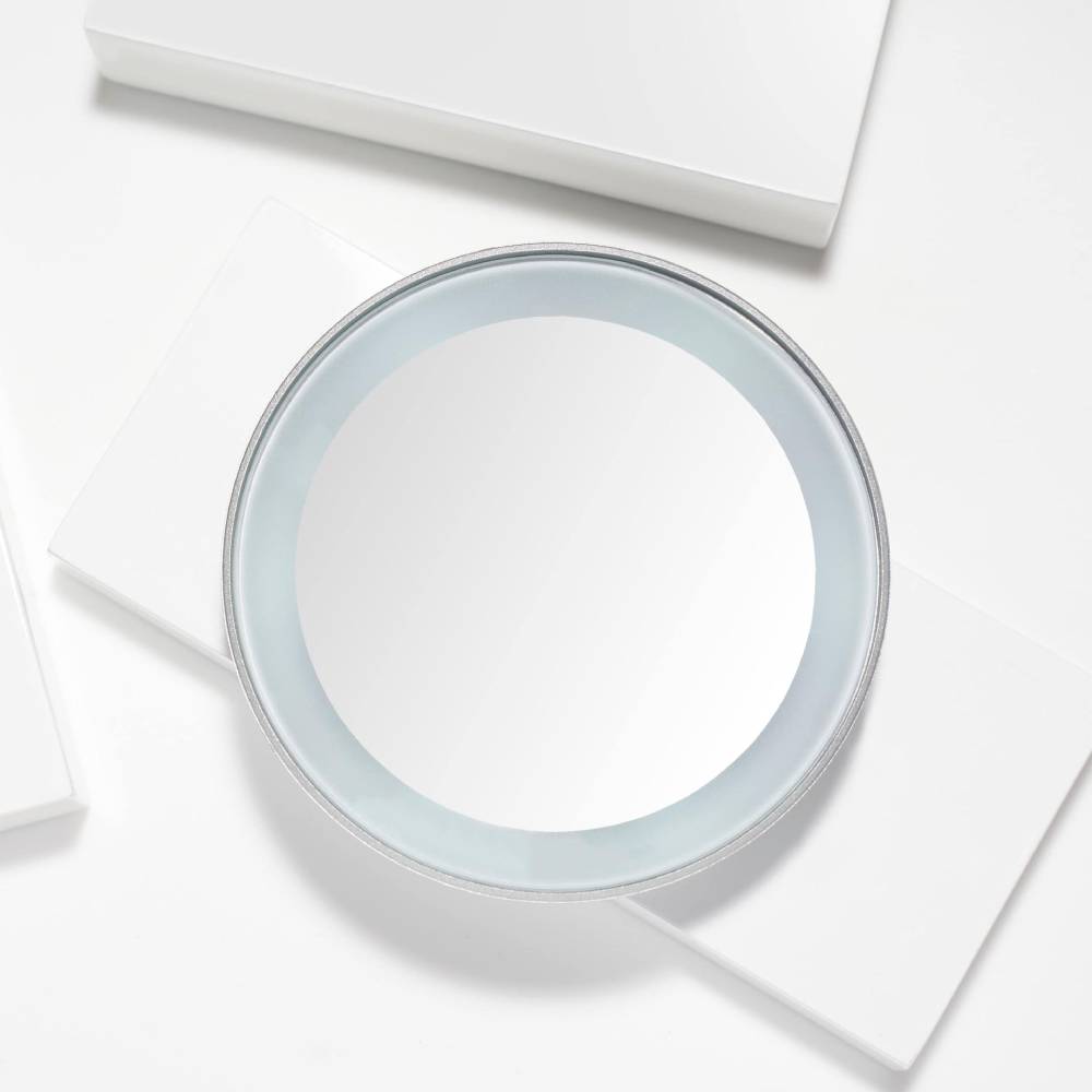 LED lighted 15x mini magnification mirror is clear from edge to edge with no distortion. Perfect for tweezing, contacts and makeup application. Attaches to any clean, smooth surface. Small size is great for travel.